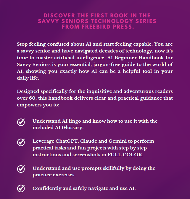 Shop Categories: All Branded Accessories books All | Branded Accessories | books | AI Beginner Handbook for Savvy Seniors Sale Price: $16.00 Original Price: $19.99 Sale Savvy Seniors Mug $15.75